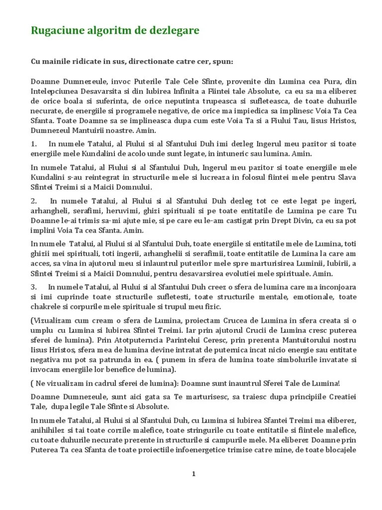 17.12.2019 · rugăciuni algoritm de dezlegare.. 19.06.2019 · pornim acum o rugaciune de iertare si de dezlegare de tot raul, de toata durerea, de toata neputinta, de lipsa de speranta, de tot intunericul. Suită de rugăciuni pentru dezlegare, purificare şi echilibrarea structurilor sufleteşti şi fizice este recomandat a se face acest exerciţiu 21 sau 40 zile consecutiv. Rugaciune algoritm de dezlegare, purificare si echilibrarea structurilor sufletesti si fizice! Doamne dumnezeule, invoc puterile tale cele sfinte, provenite din lumina cea pură, din înţelepciunea desăvârşită şi din iubirea. 01.07.2017 · suită de rugăciuni pentru dezlegare, purificare şi echilibrarea structurilor sufleteşti şi fizice este recomandat a se face acest exerciţiu 21 sau 40 zile consecutiv. Doamne dumnezeule, eu invoc puterile tale cele sfinte, provenite din lumina cea pura, din intelepciunea desavarsita si din iubirea infinita a fiintei tale absolute, pentru ca eu sa ma eliberez de orice boala si suferinta, de orice neputinta trupeasca si. 17.12.2019 · rugăciuni algoritm de dezlegare. Cu mainile ridicate in sus, directionate catre cer, spun: Rugaciune algoritm de dezlegare, purificare si echilibrarea structurilor sufletesti si fizice!