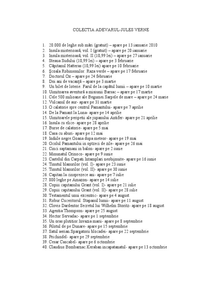 Carti colectia jules verne editura ion creanga. Colectie carti jules verne nr. Cei deja obişnuiţi cu stilul de mare narator al acestuia vor reface traseul spre centrul pământului, vor călători în adâncuri, în submarinul căpitanului nemo, sau se vor aventura pe o. Bucuresti, sectorul 1 16 iun.. Colecţia jules verne cele 40 de volume semnate de jules verne reprezintă un prilej de sărbătoare pentru toţi cei care au crescut cu poveştile uluitoare inventate de celebrul scriitor francez.